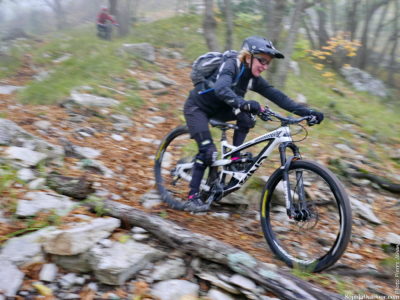 Les nuages noirs, qui s’amoncellent sur le sommet où nous devons retourner afin d’enquiller la descente de l’après-midi, nous obligent à accélérer les choses. Une bonne remontée tractée pour Viviane et Isa, un bon rythme pour les autres et c’est dans le brouillard que nous attaquons la deuxième descente. Celle-ci se déroulera entièrement dans les bois, sur des chemins recouverts de feuilles et parsemée de tremplins, virages relevés pour la joie des plus téméraires…