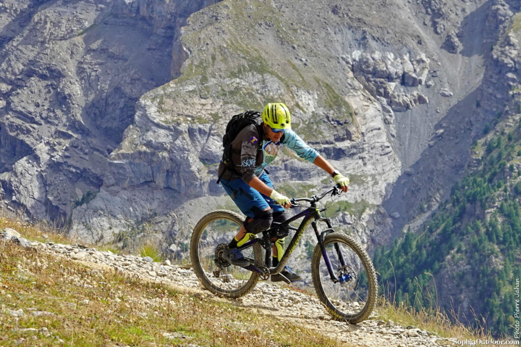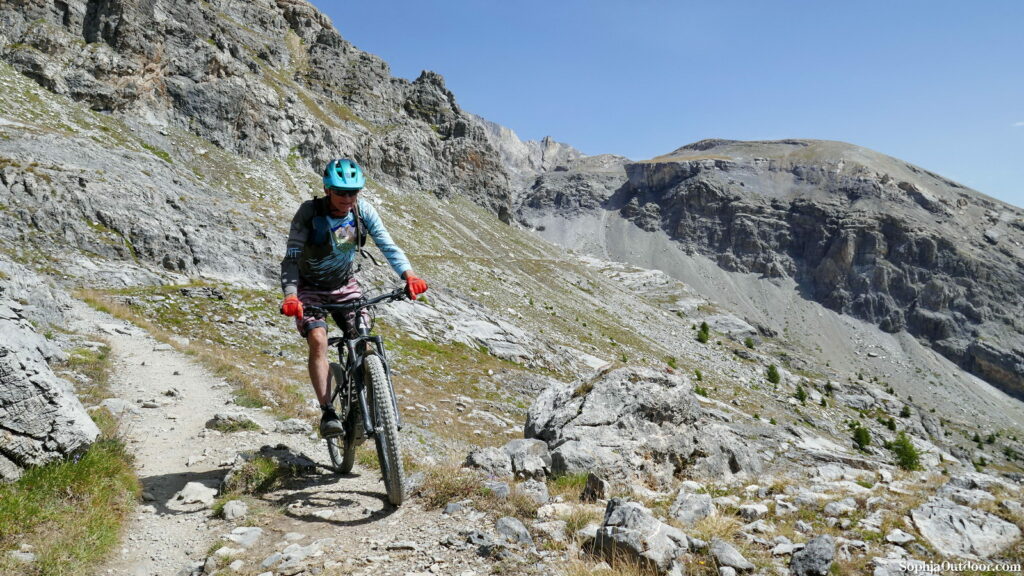 La montée vers la Pointe d’Aval se divise en deux sections : +270m de sentier en poussage jusqu’au Pas de la Sauvagea, un bref répit en crête et une montée finale de +430m assez raide dans les pierriers et la gravette, heureusement bien tracée. Les VAE abandonnent assez rapidement la partie car ce serait portage obligatoire, donc final pédestre tandis que les trois intégristes du jour Shostag, Ritter et Seb font le sommet vélo sur le dos jusqu’à 3320m d’où le panorama est exceptionnel, avec la vue plongeante sur le refuge et les nombreux lacs, le Viso et de nombreux sommets alentour, la quasi disparition des glaciers de Chauvet sous l’Aiguille de Chambeyron.