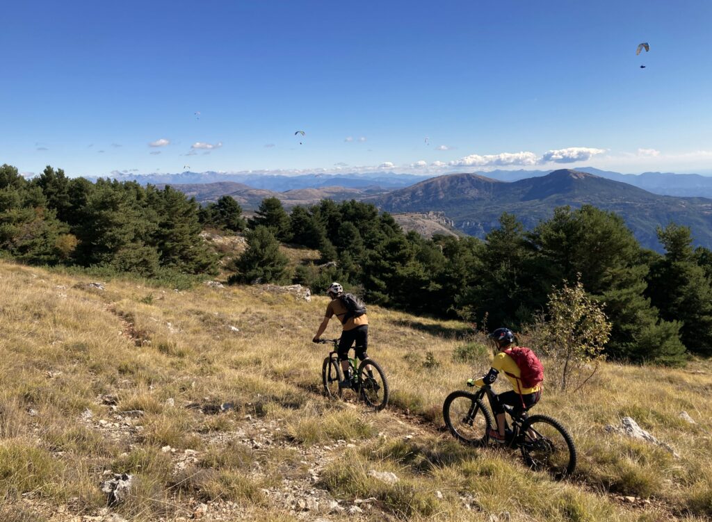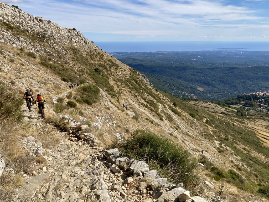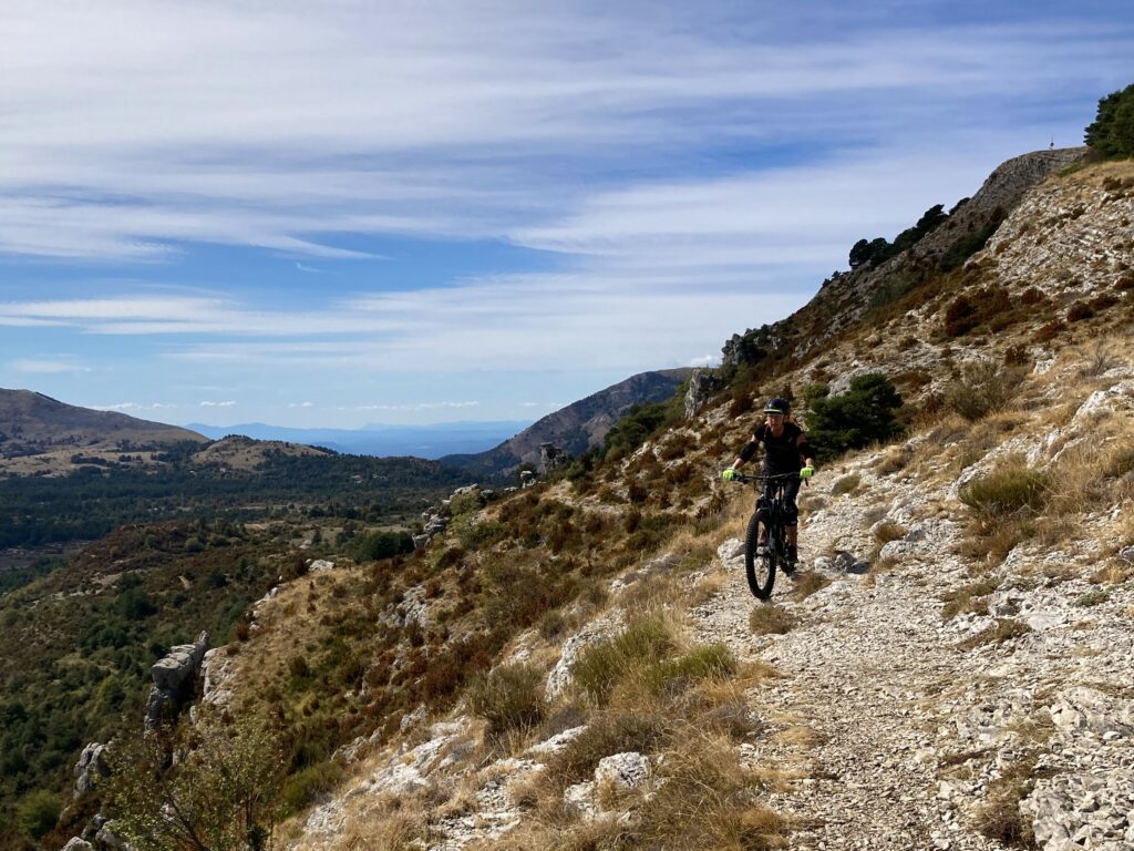 La belle piste ensoleillée du bois de Gourdon, appréciable par temps frais, le sentier de la chapelle Saint Vincent qui apporte un peu de piment avant le bout de route du col de l’Ecre. Enfin place à la piste des parapentes et enfin le dernier tronçon , la rampe bétonnée, 100% grip et 0% technique, interminable mais tellement panoramique.