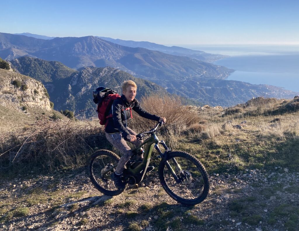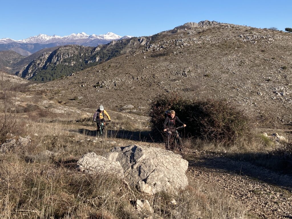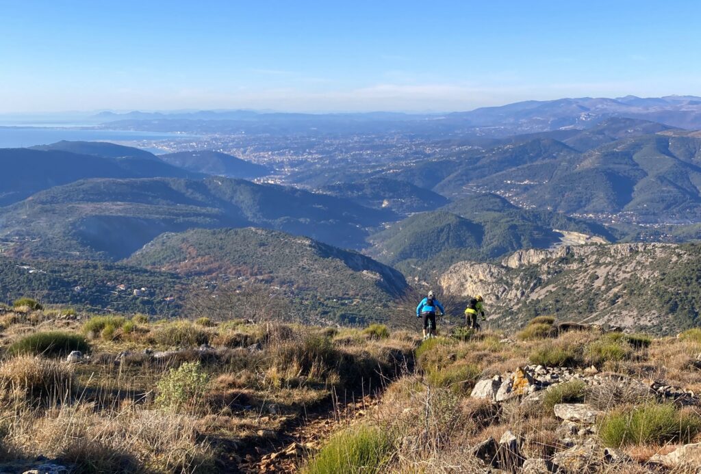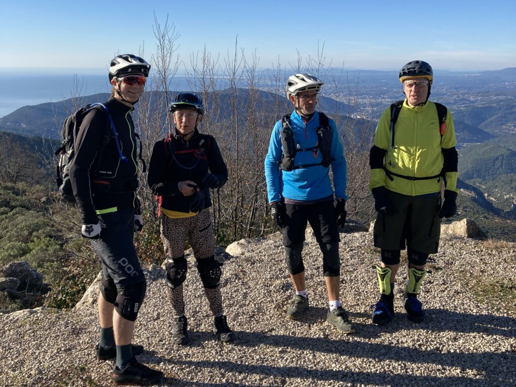 Départ du col de saint Pancrace, un bout de route nous mène d’abord au col de la madone de Gorbio que nous quittons pour rejoindre les antennes sous la cime de Gariglian ou nous récupérons le soleil. Arrivés sous les antennes, une pause panorama nous tend les bras, arrêt obligatoire à l’Ascvtt 😉
