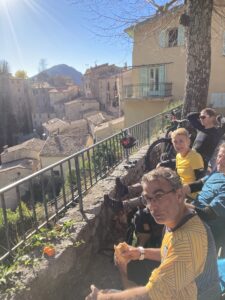 Fin de la première descente, remontée par la route jusqu’à Peille, peu de circulation c’est l’heure de déjeuner. Pour nous également dès l’arrivée au village.